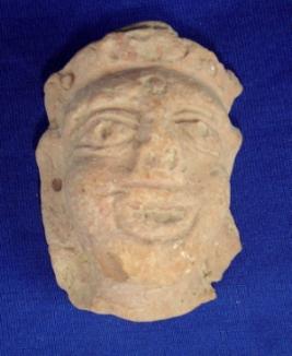 | Description / विवरण | Terracotta female head wearing a crown, has open mouth and eyes are made through incised lines. A bindi is also seen on her forehead. |