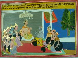 | Description / विवरण | Miniature painting based on Mahabharat - Sabha parva depicting Yudhisthir is talking to Narad and seeking his advice. |