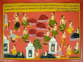 | Description / विवरण | Miniature painting based on Mahabharat - Vana parva. fighting between Parsuram and Akshatriya is depicted On top in the centre sages are depicted of a river flowing and temples made on its bank and people are taking holy dip in the river. |