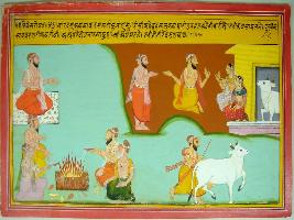 | Description / विवरण | Miniature painting based on Harivansha depicting a Brahman talking with a man and two ladies. In the other part two sages are performing a yagna with a man and a woman. A man is walking with a cow in the bottom part. |