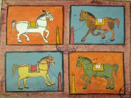 | Description / विवरण | Painting from illustrated manuscript - Shali hotra granth depicting four horses of four different colours in four squares. Horses are of white, brown, yellow and green colours. These are all tied and all fully harnessed. This manuscript contains 24 pages and 35 illustrations. |