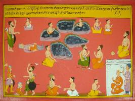 | Description / विवरण | Miniature painting based on Mahabharat - Vana parva. Parsuram is depicted is fighting with Kshatriyas, he is depicted sitting with a man and he is blessing a man lying some ponds are also depicted with two persons are taking bath in two ponds. A king also is depicted. |