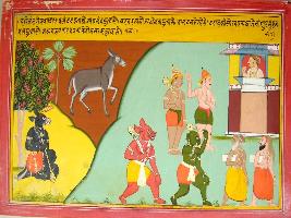 | Description / विवरण | Miniature painting based on Harivansha depicting the story related to Tar demon, who is sitting under a tree. Two demons torturing two sages and two men are informing the king. |