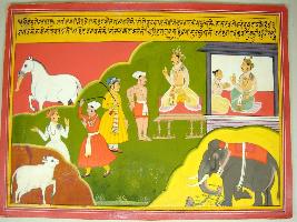 | Description / विवरण | Miniature painting based on Harivansha depicting Raja Ugrasena giving verdict to a criminal in the court, while in the four corners- Keshi Horse eating a man, a king with a sage, a cow and an elephant are depicted. |