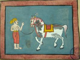 | Description / विवरण | Painting from illustrated manuscript - Shali hotra granth depicting a horse and a man holding its rope and the colour of the horse is white. This manuscript contains 24 pages and 35 illustrations. |