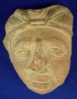 | Description / विवरण | Human head wearing an elaborate head gear. It has open eyes, thick lips and nose which is mutilated. The ears are missing. |