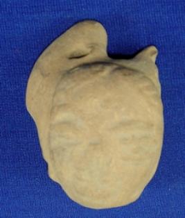 | Description / विवरण | Human head having open eyes and parted hair. The right eye, nose and part of lip are mutilated. It is wearing an elaborate head gear which is broken at left side. |