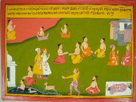 | Description / विवरण | Miniature painting based on Mahabharat - Vana parva depicting sanctity of pilgrimage of Manush tirth depicting a deer jumps in to water and changed into human. He got freet from curse. It also depicts that by taking dip in Manush Tirth and in river Aapganam and doing penance over there, bad to moksha. |