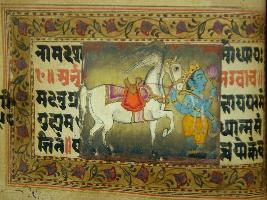 | Description / विवरण | A leaf of illustrated manuscript based on Bhagwat Gita depicting Vishnu is going with a horse. This manuscript has illustration on 26 pages. |