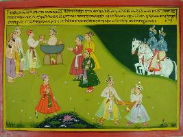 | Description / विवरण | Miniature painting based on Mahabharat - Ashwamegh parva depicting Sudhana telling his ministers that he get the same punishment like a thief. He also says that he did not attack Krishna and today Krishna will save him, in the way he save Draupadi. By praying Krishna he lied in the boiled oil, in the way lotus float in water viewers and the king surprised by seeing him not affected by boiled oil. |