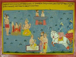 | Description / विवरण | Miniature painting based on Mahabharat - Ashwamegh parva depicting Hansadhwaja telling his son that he is a great devotee of Krishna that why the boiled oil could not harm him. After that king said that Krishna save Prahlad by taking the incarnation of Narasimha, and ask Sudhana to fight with Krishna who come to fight with them. |