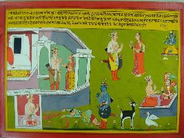 | Description / विवरण | Miniature painting based on Mahabharat - Ashwamegh parva depicting Sughamba and her husband inside the palace then Krishna came to meet him. It also depict the son Senghamba, on the other hand a Gandharva couple is depicted and Vishnu is seen on top. |