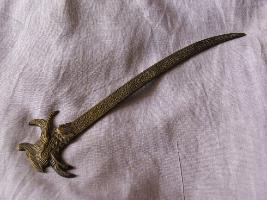 | Description / विवरण | It is a long tilted katar at the extreme end, decorated with inlay work on upper portion and the hilt is designed like a pair of fishes. |