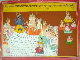 | Description / विवरण | Miniature painting based on Harivansha depicting Lord Vishnu along with other deities such as Brahma, Shiv and others. Brahma asks Vishnu to take incarnation on the Earth. On the left of the painting Devta are seated on viman . |