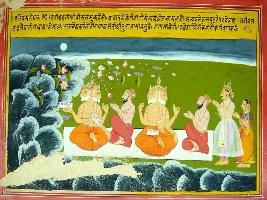 | Description / विवरण | Miniature painting based on Harivansha depicting Brahma ji talking with Shri Basantak and again Brahma is seen talking with Basantak and Raja Basack, near a sea. |