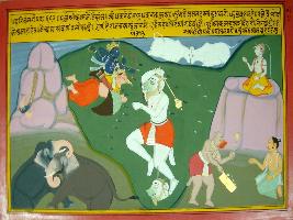 | Description / विवरण | Miniature painting based on Harivansha depicting fight between Vishnu, seated on Garuda, and Nikumbha and then Vishnu killing him in the centre. They are fighting like two bulls and elephants. At the upper left Shiv s is watching the fight, below whom a demon and a man are seen. |