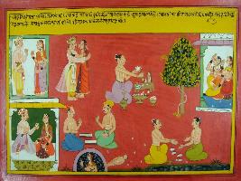 | Description / विवरण | Miniature painting based on Mahabharat - Ashwamegh parva depicting that if one breaks his meditation in middle will go to hell and if one break the menstruation period of a woman will become an Aasur. It also depict the time for performing shradha for father. |