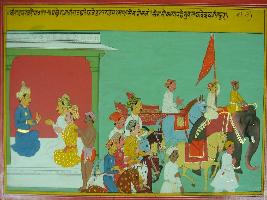 | Description / विवरण | Miniature painting based on Mahabharat - Virat parva. The painting depicts Viratraj that talking with two nobles and the cattle hidden come to meet Viratraj and saying thanks to him. While in the other part of the painting depicts a preocession accompained by elephant and horses. |