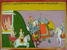| Description / विवरण | Miniature painting based on Mahabharat - Ashwamegh parva depicting after love making with his wife, Sudhana move forward with his army. At that time a messenger of king came and says that he came here to arrest him and he have to go with him. |