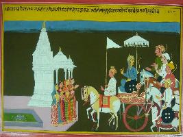 | Description / विवरण | Miniature painting based on Mahabharat - Virat parva. The painting depicts that king Virat comes back from the battle field with Pandavas. Female attendants informs him about the marching of Uttar with Brihanala against Kauravas. |