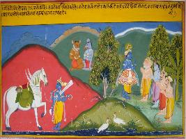 | Description / विवरण | Miniature painting based on Geet Govind where Jaidev says about the Vishnu Kalki avatar. The painting says that by the Kalki avatar Vishnu would kill the demons so Krishna asks Brahma, Shiv, Indra and Ayudh purush to pay respect to Vishnu for his Kalki avatar. |