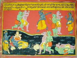 | Description / विवरण | Miniature painting based on Harivansha depicting a fight scene between two demon and Vishnu and Vishnu killing them. Brahma who was hiding in the lotus flower, reside in the naval point of lying Vishnu. |
