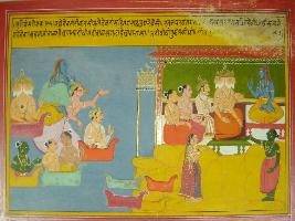 | Description / विवरण | Miniature painting based on Harivansha depicting all the Devtas like Brahma, Indra, Narad coming on viman. All the Devtas are seated with folded hands in front of Shiv. At the lower part Vayu is talking to a lady. |