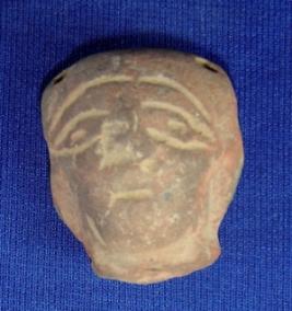 | Description / विवरण | Terracotta human head whose eyes, lips are depicted with incised lines. The nose is slightly flaked off. At the back of head three holes are seen. |