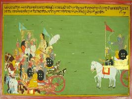 | Description / विवरण | Miniature painting based on Mahabharat - Virat parva depicting after the defeat, Bhishma insulting Duryodhan by saying that where his power has gone during the battle and they are fortunate that Arjun did not kill them. By saying this Bhishma ask Duryodhan to return to Hastinapur. Arjun throws the arrows of repect to all but his arrow hit the crown of Duryodhan. |