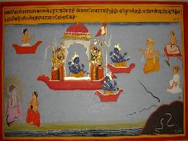 | Description / विवरण | Miniature painting based on Kashi khand depicting Vishnu with two Andhpurusha and Brahma. In the right below of the painting Agastsya muni and Lopamudra is seen where Agastsya muni says that Shivsharma visited many holy places. |
