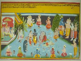 | Description / विवरण | Miniature painting based on Geet Govind depicting the king and Jaidev in the right side of the painting where Jaidev says to king about the role of Vishnu s incarnations to maintain peace in the creation. In the left side of painting the incarnation of Vishnu, Brahma, Shiv are depicted. |