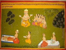 | Description / विवरण | Miniature painting based on Kashi khand depicting Brihaspati preaching to the disciples that how to live good quality life How to learn politics How to serve the guru These scenes are shown in the painting. |