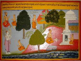| Description / विवरण | Miniature painting based on Kashi khand depicting a devotee going near to Brihaspati. In Kashi there are 1000 Shiv Lingas, a devotee worships all the 1000 Lingas on flat devotion. Shiv is pleased with him and asked him to desire any wish. |