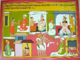 | Description / विवरण | Miniature painting based on Harivansha depicting different duties of king. Upper row of the painting depicts a king giving daan to a Brahman. Next to it, king is talking to a Brahman and a noble respectively. At the lower right a king is sitting and a female is seen. Next to them, two hunters a talking to a noble man and he is giving them money. |