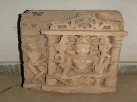 | Description / विवरण | This sculpture depicts Parvati the consort of Shiva . The four armed goddess is shown holding lotus bud, trident axamala in her hand and sitted on Nandi bull. She is flanked by a male attendant. |