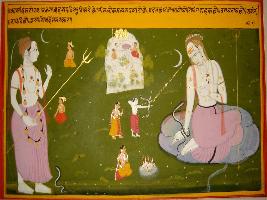 | Description / विवरण | Miniature painting based on Kashi khand depicting Brihaspati enchanting the name of Shiv, who is capable of destroying the three worlds Trilok . So one should recite the name of Shiv and Parvati. |
