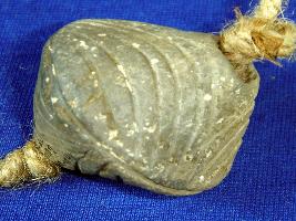 | Description / विवरण | Large, perforated terracotta bead of bi-convex shape. There are incised dot and line design around the holes and perforation all over the head. Large portion of one side is broken. |