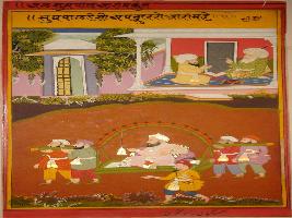 | Description / विवरण | Miniature painting based on Mullah-do-Piyaja depicting Mullah-do-Piyaja is telling Akbar that Hakim gets every luxury in life. |