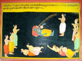 | Description / विवरण | Miniature painting based on Harivansha. Vishnu is depicted lying and he is surrounded by many Devtas and Gandharvas. |