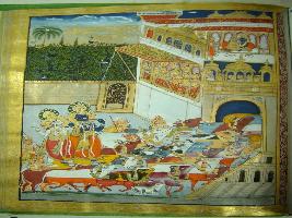 | Description / विवरण | Miniature painting depicting Krishna and Baldev that coming back to home from Vrindavan with their cattle while the gopis are seen that watching from the palatial balcony. |
