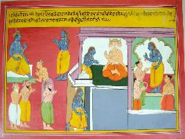 | Description / विवरण | Miniature painting based on Harivansha depicting the story of Kalrevi. He is depicting going to Brahma lok in lower part, In extreme left part sages are shown worshiping him. To its right, he is shown with Brahma, at the top left, he shown with folded hands in front of Vishnu. |