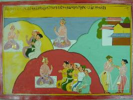| Description / विवरण | Miniature painting based on Mahabharat - Sabha parva depicting Yudhisthir is advising his people that they should be unified. |