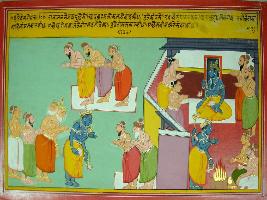 | Description / विवरण | Miniature painting based on Harivansha depicting lord Vishnu and Brahma standing and entering Brahma lok and sages welcoming them with folded hands. In the left side Vishnu is making an appearance at yagna performed by two sages. Above this lord Vishnu is shown talking to other sages. |