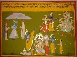 | Description / विवरण | Miniature painting based on Kashi khand depicting Dhruv praying to lord Vishnu and Garuda shown standing nearby at lower left. Incarnations of Vishnu are depicted in rest of painting. To left of Garuda, Narasimha is shown killing Hiranyakashyap. To its left, Tri Vikram Vishnu is shown stepping his leg over Raja Bali. At upper left Ram is shown killing Ravan. To its left, Parasurama is shown stretching bow string. At the upper left Krishna is depicting lifting Govardhan Parvat from his finger and playing flute. |