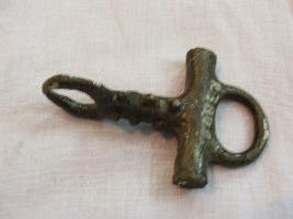 | Description / विवरण | This is a metallic object having two circular sockets at both ends. Its shape is like Roman letter T having horizontal and a vertical bar. The vertical bar has got six raised knobs or dots, three in one row. |
