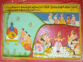 | Description / विवरण | Miniature painting based on Harivansha depicting Krishna sitting with three sages sitting in front of him in the right side. On top Indra is talking to Shiv and five headed deity, a demon and a man are watching them. In the lower side a king is to seated kings at either side. |