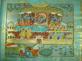 | Description / विवरण | Miniature painting depicting the Vasudev avatar of Vishnu where eight armed Vishnu is seen sitting in the centre. On the other hand some follower including Arjun are also seen. In the lower part the chariot of Vasudev is also seen. |