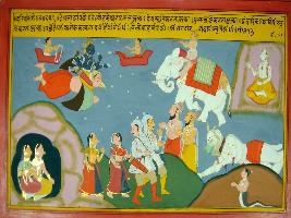 | Description / विवरण | Miniature painting based on Harivansha depicting demon Nisumbha, Vishnu and other Devtas. The writing on the top describes that after the death of Nisumbha, Devtas are praying Vishnu, offering flowers to him. Brahmans are also depicted praying Vishnu. At the lower left corner two women are depicted who are taken away by Yadavs. At the lower left corner one naga figure is depicted. While Shiv is depicted on upper left corner. |