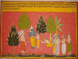| Description / विवरण | Miniature painting based on Kashi khand depicting a scene on the bank of river. Vishnu and Garuda is depicted here with some sages. |