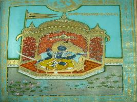 | Description / विवरण | Miniature painting depicting four armed Pradyuman avatar of Vishnu. His attributes from night below 1 sword 2 Varaha mudra 3 conch 4 one chest. |